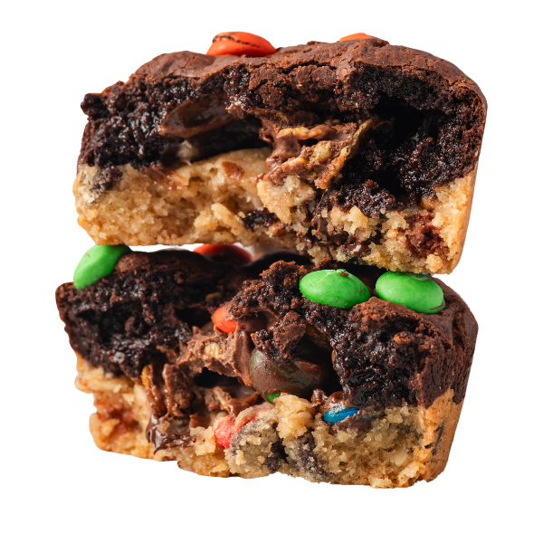 A warm Monster cookie base, stuffed with a Chocolate Peanut Butter and M&M Crunch core, covered by a warm Dark Chocolate Brownie layer, and topped with M&Ms