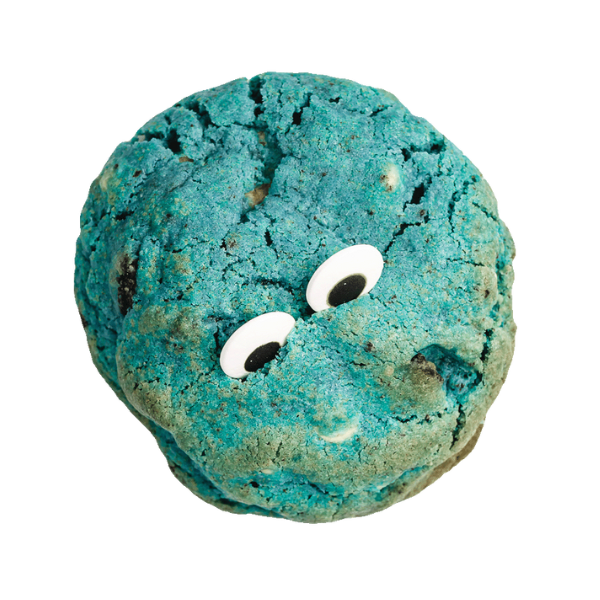 The best of both worlds: a warm chocolate chip cookie butter core stuffed inside Blue Cookies n' Cream dough, baked to perfection, then topped off with two candy eyes. The Blue Cookies n' Cream is a blue vanilla base with creamy white chocolate chips and crunchy OREO® Cookie Pieces