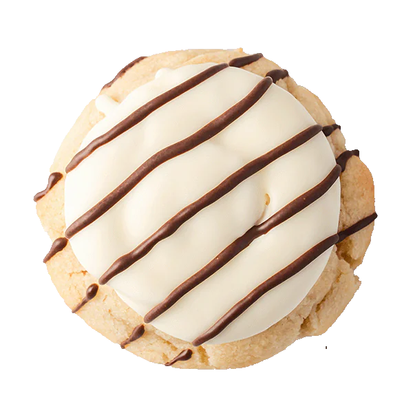 Chilled sugar cookie base with a hint of birthday cake and topped with marshmallow fluff buttercream and dipped in a white chocolate shell then drizzled with semi-sweet chocolate