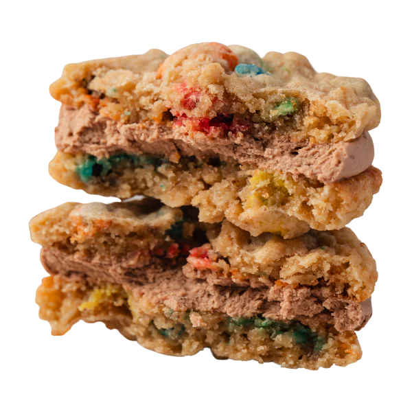 Creamy milk chocolate buttercream sandwiched between two chewy peanut butter oatmeal cookies with crunchy milk chocolate M&Ms® mixed in